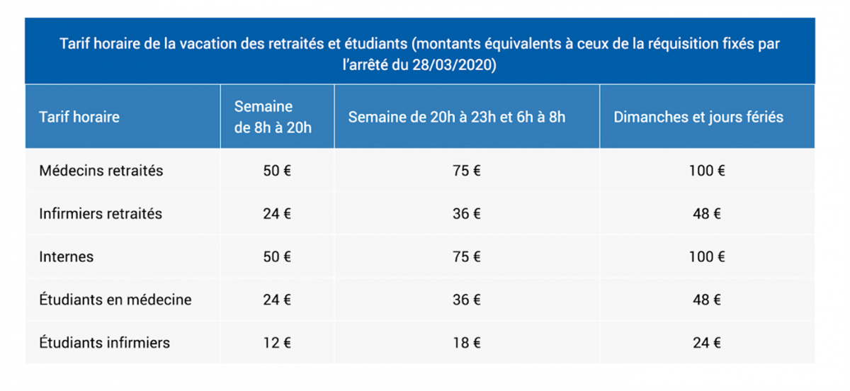 Les médecins retraités ayant été sollicités pour vacciner dans les centres de vaccination Covid mais n’étant plus référencés dans les systèmes d’information de l’Assurance maladie, un arrêté publié le 6 février au Journal officiel a déterminé le barème dérogatoire national qui s'appliquera par heure de vacation réalisée. Ainsi, ils toucheront 50 euros par heure pour une vacation effectuée en semaine, entre 8h et 20h. Entre 20h et 23h ou 6h et 8h, le forfait horaire a été fixé à 75 euros. Enfin, les dimanches et jours fériés, il sera de 100 euros par heure.