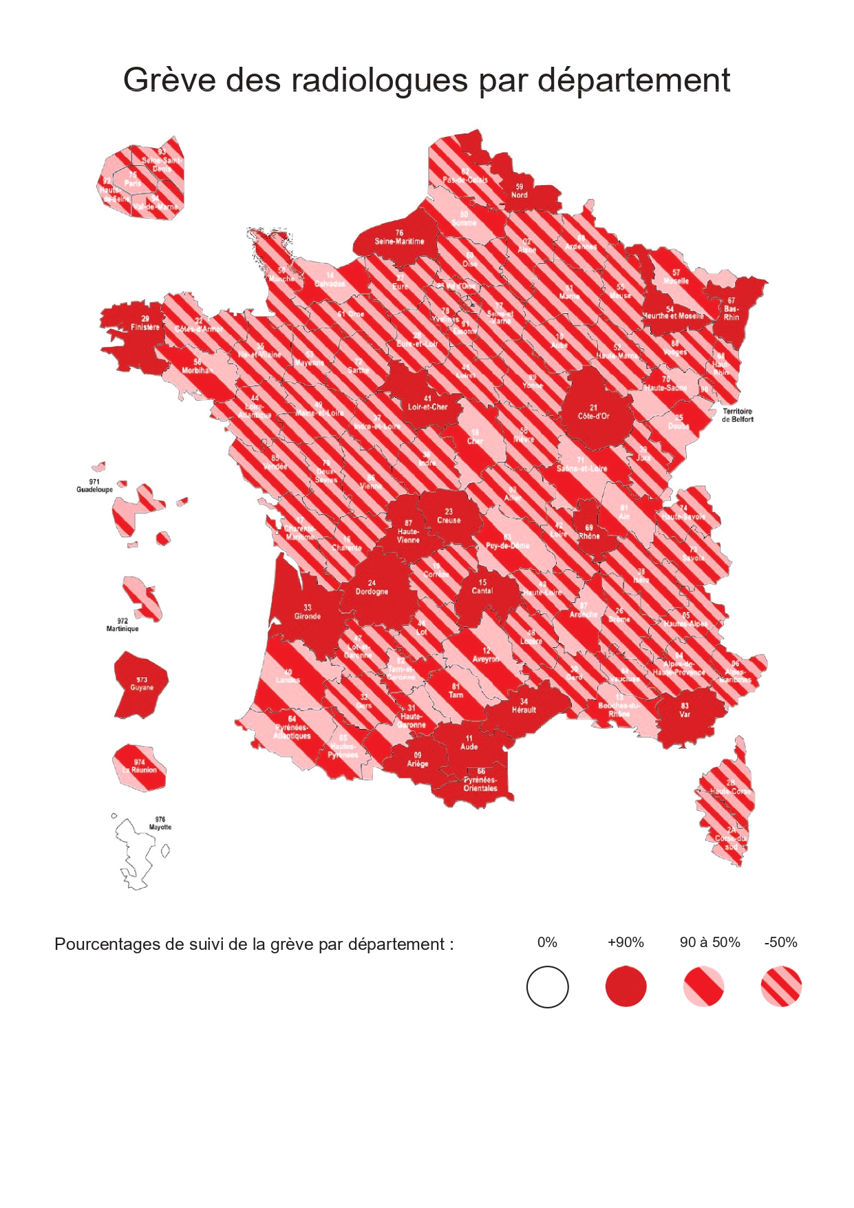 "De 30% à Paris, jusqu'à 100% en Alsace, en Creuse ou encore en Gironde. La grève concerne 70 à 80% des radiologues au niveau national, nous sommes très satisfaits de ce mouvement", a commenté pour Egora le Dr Jean-Philippe Masson, président de la Fédération nationale des médecins radiologues (FNMR), qui a établi une carte nationale de la mobilisation.