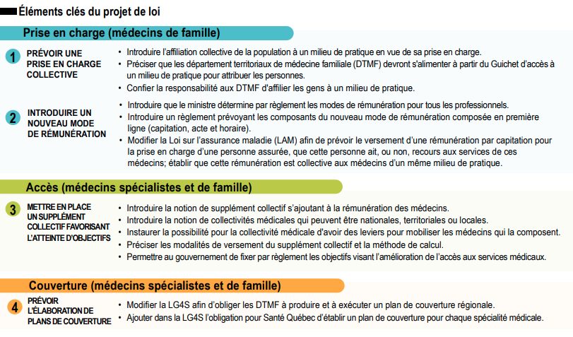 Actuellement, les médecins sont uniquement rémunérés à l'acte au Québec, mais ce projet de loi prévoit d'introduire en complément une part de paiement par capitation et une part de paiement au taux horaire, afin de reconnaître le travail fait au-delà des actes médicaux (travail de bureau, les appels aux collègues…). "On veut un modèle plus simple, adapté aux réalités d’aujourd’hui, qui permet de prendre le temps nécessaire lors d’un rendez-vous, d’encourager la collaboration avec les infirmières, les IPS [infirmiers praticiens spécialisés], les pharmaciens ainsi que d’autres professionnels, et de mieux répartir la charge de travail", a notamment détaillé le ministre de la Santé, sur le réseau social LinkedIn.