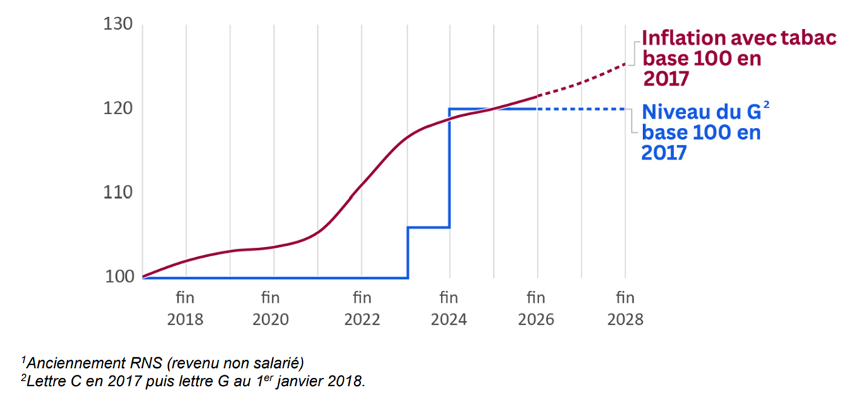 "Cette augmentation des revenus doit être mise en perspective avec l'inflation depuis 2017, date de la précédente mise à niveau de la valeur des actes", souligne par ailleurs la Carmf. La hausse du G pour les généralistes n'a ainsi fait que compenser l'inflation depuis 2017 selon un graphique publié par la Carmf, et s'appuyant sur les données de l'Insee (de 2017 à 2024) et de la Banque de France (de 2025 à 2028).