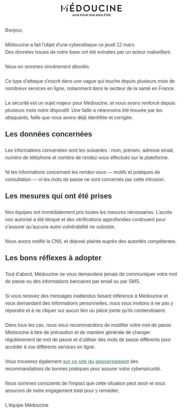 Médoucine ne précise pas combien de personnes ont potentiellement été touchées par cette fuite de données, ni combien de données ont précisément été extraites. Contactée par Egora, la plateforme n'a pas encore répondu à nos sollicitations à l'heure où nous écrivons ces lignes.