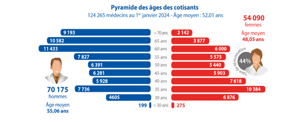 Globalement, la moyenne d'âge de l'ensemble des médecins libéraux poursuit sa lente diminution. Il est, en 2024, de 52,01 ans. En 2019, il était de 53,18 ans.