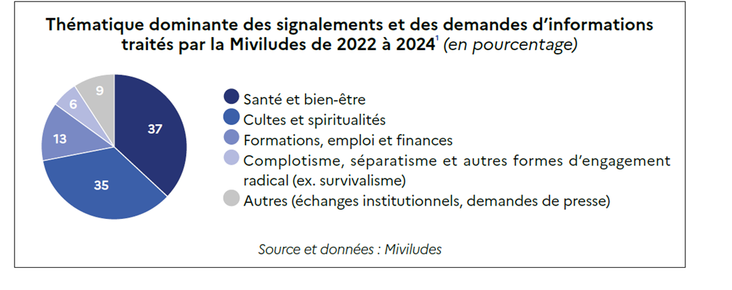 La santé est le secteur le plus touché par les signalements de dérives sectaires, indique la Mission interministérielle de lutte contre les dérives sectaires (Miviludes) dans son dernier rapport d'activité. En 2024, la Miviludes a reçu 4 571 saisines (tous domaines confondus), soit 111% de plus qu'en 2015. Les malades du cancer sont particulièrement touchés.