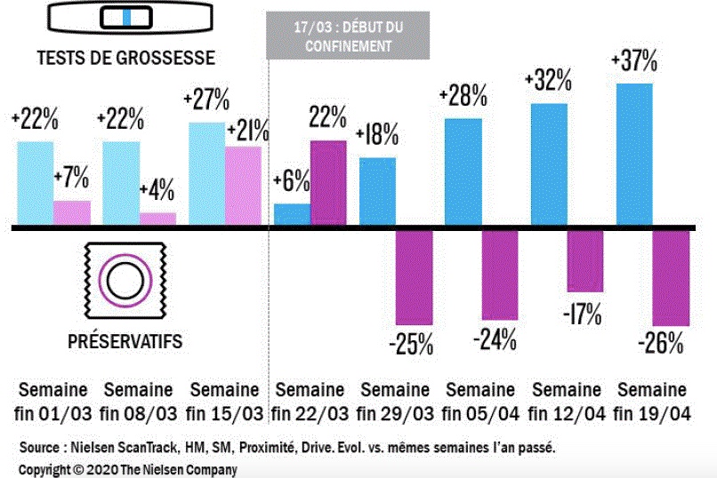 En parallèle, les ventes de tests de grossesse dans les supermarchés se sont envolées de +6 % du 15 au 22 mars, par rapport à la même période l'année dernière ; +18 % la semaine suivante ; +28 % la troisième semaine du confinement, +32% la quatrième semaine et +37 % la cinquième (du 13 au 19 avril), selon la société internationale de mesure & analyse des données Nielsen Groupe.