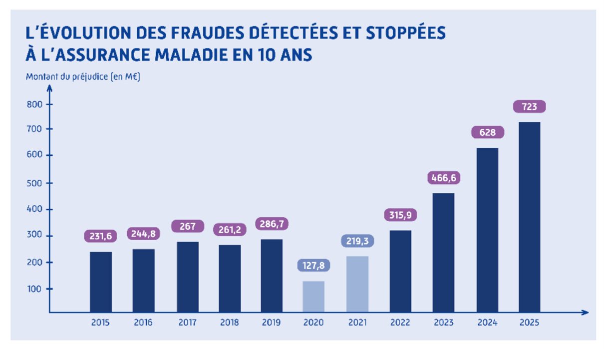 L'Assurance maladie a enregistré une "nouvelle année record" en matière de fraudes. En 2025, 723 millions d'euros de fraudes ont ainsi été détectées et stoppées, contre 628 millions l'année précédente. Les fraudes commises par les professionnels de santé libéraux concentraient près de trois quarts des montants.