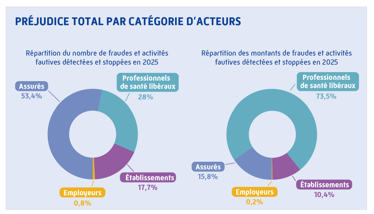 Si, en nombre, les assurés représentent la majeure partie (53,4 %) des fraudes et activités fictives détectées et stoppées en 2025, l'essentiel des montants détournés provient en réalité "d'une infime minorité" de professionnels de santé libéraux (73,5 % contre 15,8 % pour les assurés et 10,4 % pour les établissements), souligne la Caisse.