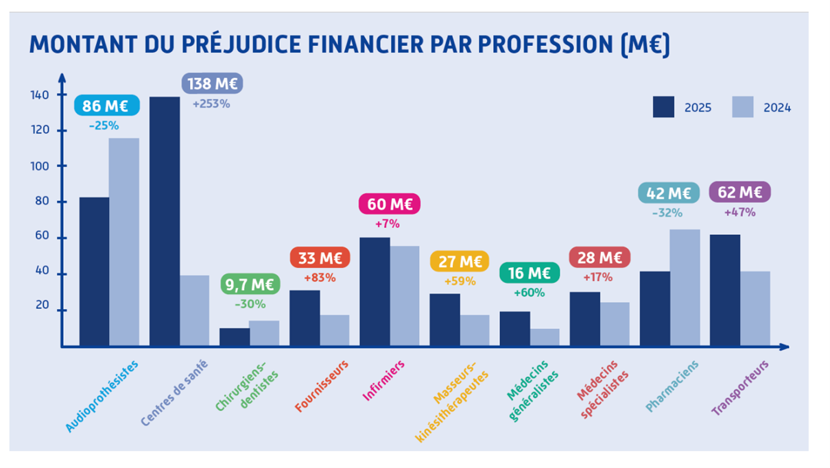 Sont particulièrement touchés par ce phénomène : les centres de santé (138 millions de fraudes détectées et stoppées), le champ des audioprothèses (86 millions d'euros de fraudes détectées et stoppées en 2025), les transporteurs (62 millions, en progression de 50 %), et les fournisseurs de dispositifs médicaux (33 millions d'euros de fraudes détectées et stoppées).