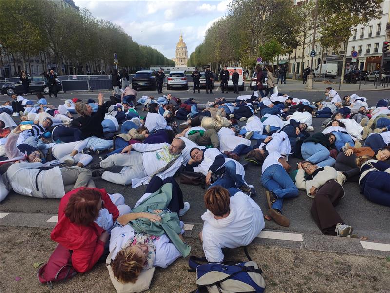 Certes, ils n’ont pas été reçus, “mais je ne pense pas qu’on puisse en rester là”, pose Olivier Varnet, du syndicat national des médecins hospitaliers FO (SNMH-FO). Il poursuit : “Ce qu’on a fait aujourd’hui, ce n’est que le début du regroupement de tous les professionnels de santé avec les malades, pour ne pas accepter ces budgets de misère”, dit-il, sous les applaudissements. “Il faut qu’on prenne date pour continuer ce mouvement, l’amplifier”. En attendant, pour clore la marche blanche avec “un truc un peu visuel”, le médiatique Arnaud Chiche propose aux marcheurs de s'allonger sur le bitume : “La santé en PLS !” “La santé à terre”. Elle ne demande qu’à ce qu'on lui donne les moyens de se relever.