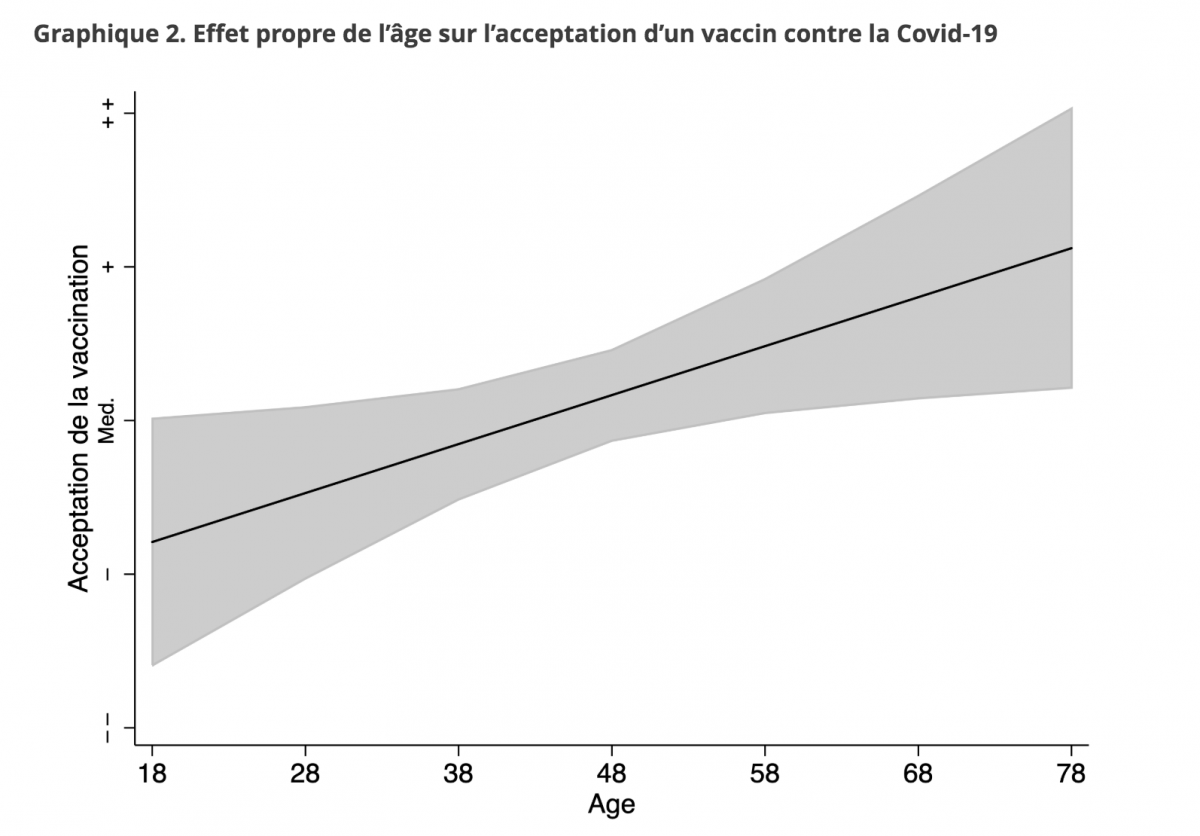 Pour comprendre cette défiance et ce scepticisme français, cette dernière a décidé, dans une grande étude, de dresser un profil sociologique de ceux que l’on qualifie communément d'“antivax”. Il apparaît d’abord que les jeunes générations sont les plus hostiles au vaccin, 52% d’entre eux ayant entre 25 et 34 ans. Les jeunes déclarent en effet avoir moins peur des conséquences sanitaires de l’épidémie ; ils ont donc moins d’intérêt à se faire vacciner. En revanche, le phénomène est inverse pour les populations plus âgées, comme le montre ce graphique :