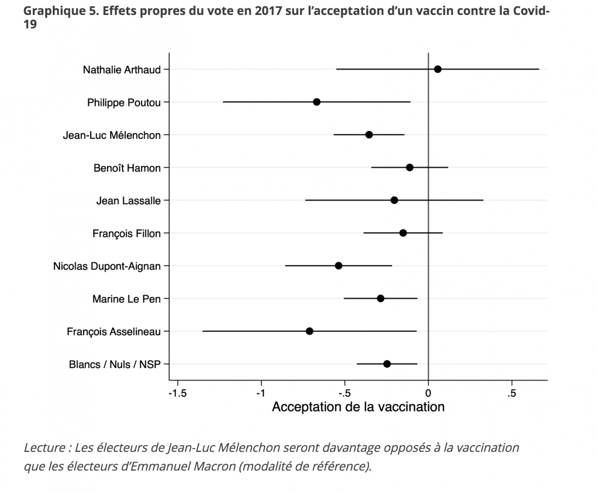 nombreuses à craindre des effets indésirables de l’injection et rester sceptique sur sa réelle efficacité. Pour compléter leur profil, la Fondation Jean Jaurès s’est intéressée à leur positionnement politique. Bien qu’aucun parti ne soit ouvertement anti-vaccination en France, contrairement au Mouvement 5 étoiles en Italie par exemple, l’étude révèle que les électeurs de Marine Le Pen, François Asselineau, Jean-Luc Mélenchon et Nicolas Dupont-Aignan sont “beaucoup plus” antivax que les autres électeurs. De plus, 35% des antivax sont ouvertement contre le port du masque.