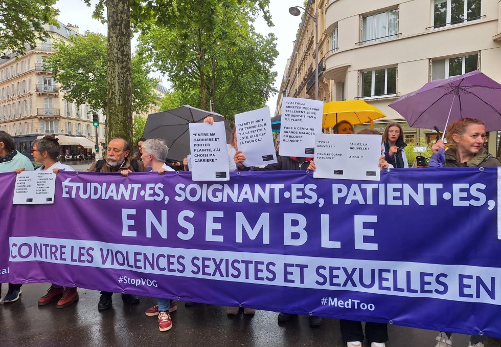 Unies, les participantes – soutenues par plusieurs associations féministes comme Osez le féminisme ! – ont réclamé des "mesures concrètes et immédiates" de lutte contre les violences sexistes et sexuelles (VSS), qui touchent tout particulièrement le milieu du soin. "Stop à l'omerta en médecine", "aujourd'hui ton violeur, demain ton docteur", "ras le viol"… pouvait-on ainsi lire sur des pancartes brandies haut.