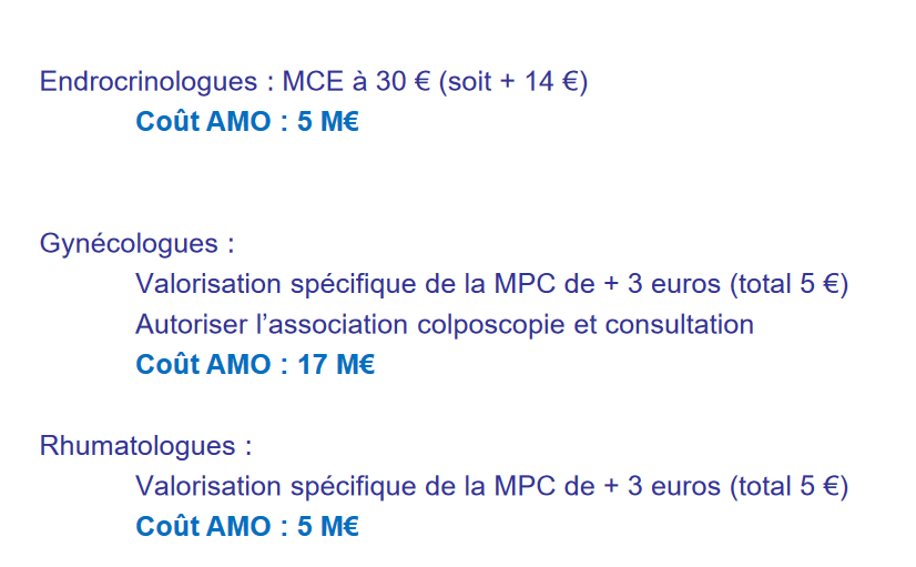 les consultations de dépistage des troubles du neuro-développement pour un montant de 60 euros. Des consultations de mise en place de la stratégie thérapeutique pour trouble du neuro-développement (autisme et autres troubles) seront également côtées à hauteur de 60 euros. En psychiatrie, certains actes seront également revalorisés. Les consultations passeront à 41 euros et les consultations en urgences à 78 euros. Les endocrinologies, gynécologues et rhumatologues devraient également être revalorisés, alors que cela n'était pas prévu dans la lettre de cadrage. Le total de ces revalorisations pour l'ensemble des spécialités citées s'établirait à 78 millions d'euros.