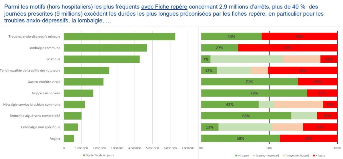 Reste que pour les motifs d'arrêt les plus fréquents (hors hospitaliers), plus de 40% des journées prescrites excèdent les durées les plus longues préconisées dans ces référentiels, remarque la Cnam. C'est notamment le cas pour les troubles anxio-dépressifs mineurs (56% de journées en excès) et pour la lombalgie commune (73%).