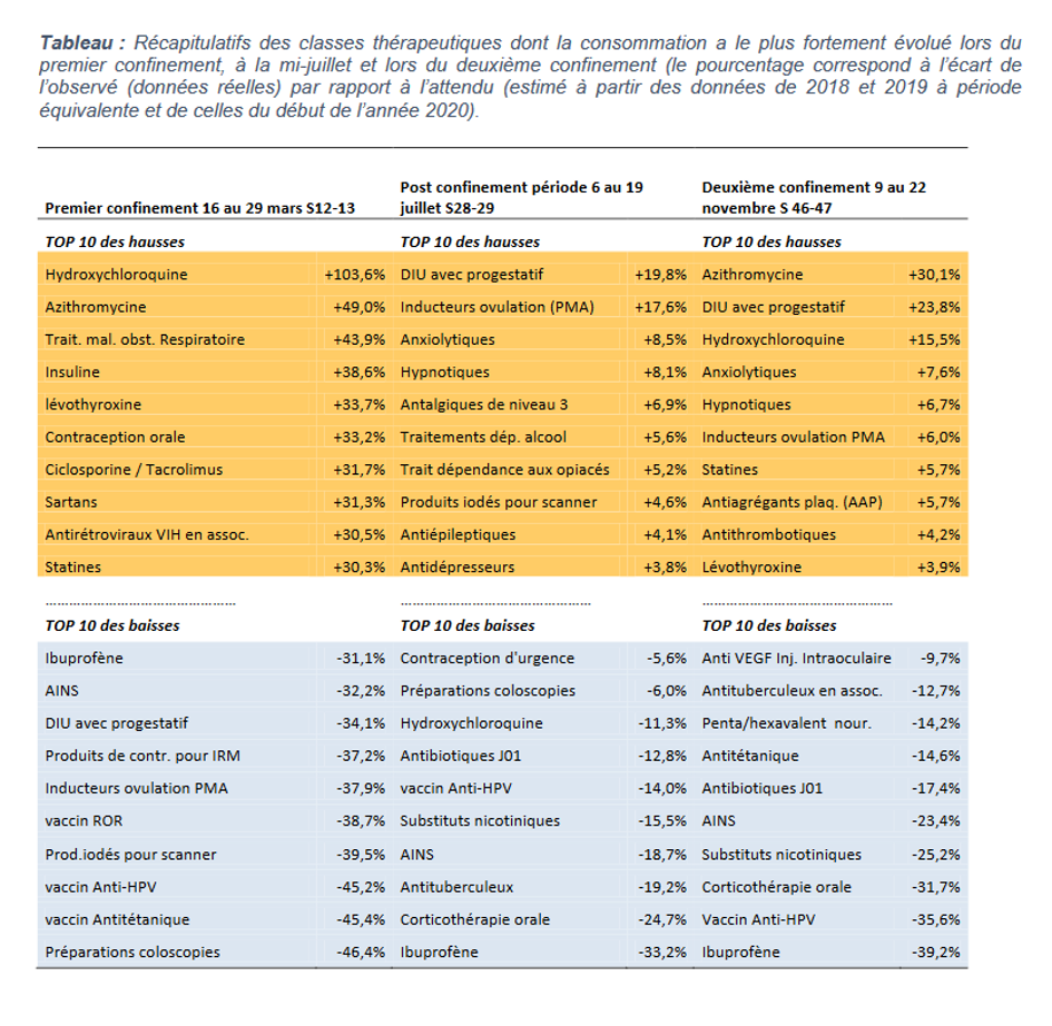 EPI-Phare* réalise depuis le début du premier confinement le suivi de la consommation des médicaments sur ordonnance délivrés en ville en France pour l’ensemble de la population française, à partir des données du Système national des données de santé (SNDS). Le 5e rapport, publié mercredi 16 décembre, inclut les semaines 2 et 3 du confinement. S'il "n'y a pas de phénomène de stockage de médicaments pour les maladies chroniques comme lors du premier confinement", la comparaison avec l'année dernière révèle des bouleversements majeurs. En novembre, la consommation d'azithromycine reste ainsi très élevée par rapport à l'attendu (+30.1%), bien que la hausse soit inférieure à celle constatée en mars (+49%). De même pour l'hydroxychloroquine : +15.5% par rapport à novembre 2019 (+103.6% en mars 2020 par rapport à mars 2019). L'utilisation d'anxiolytiques (+7.6%) et d'hypnotiques (+6.7%) reste supérieure à l'attendu. La hausse avait été constatée entre les vagues épidémiques, lors du déconfinement.