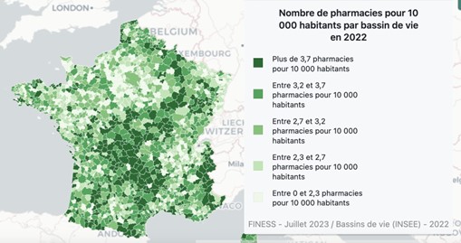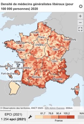 Au niveau des EPCI (proches des anciens cantons), les médecins généralistes libéraux sont également mieux répartis que les infirmiers ou les pharmaciens.