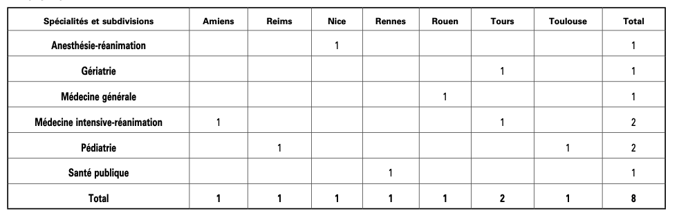 Ces 8 postes seront offerts parmi 6 spécialités. Ils sont répartis entre sept villes (Amiens, Reims, Nice, Rennes, Rouen, Tours, Toulouse) de la manière suivante :