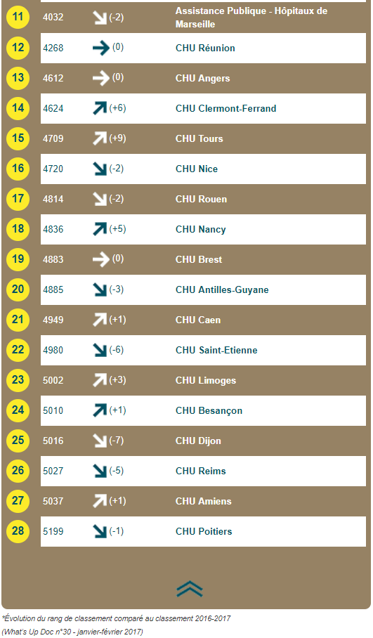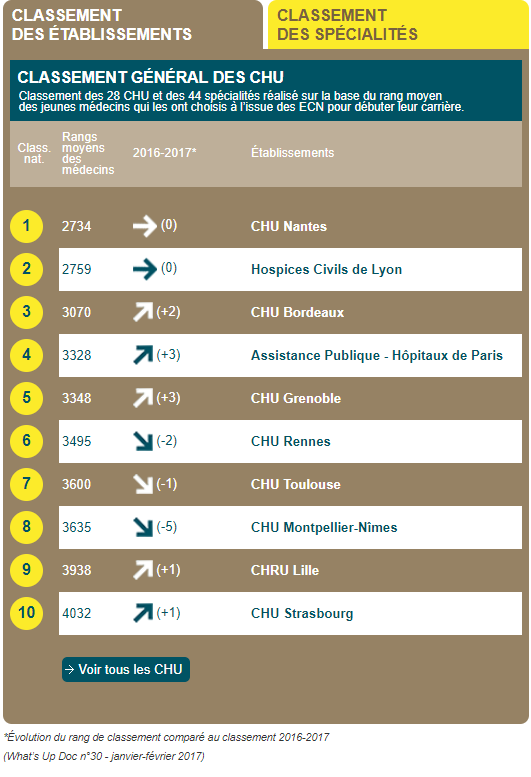 Cette année encore les deux premières places du classement sont occupées par le CHU de Nantes et les Hospices Civils de Lyon. En revanche, le CHU de Bordeaux est parvenu à se hisser à la troisième place alors qu'elle était occupé par le CHU Montpellier-Nîmes l'an passé. L'AP-HP obtient la quatrième place alors qu'elle n'était que 7ème l'année dernière. En ce qui concerne les spécialités les trois premières places sont occupée cette année par la Chirurgie plastique, reconstructrice et esthétique, l'ophtalmologie et les maladies infectieuses et tropicales. L'an dernier les trois spécialités les plus choisies étaient l'ophtalmologie, la néphrologie et la médecine interne et immunologie clinique.