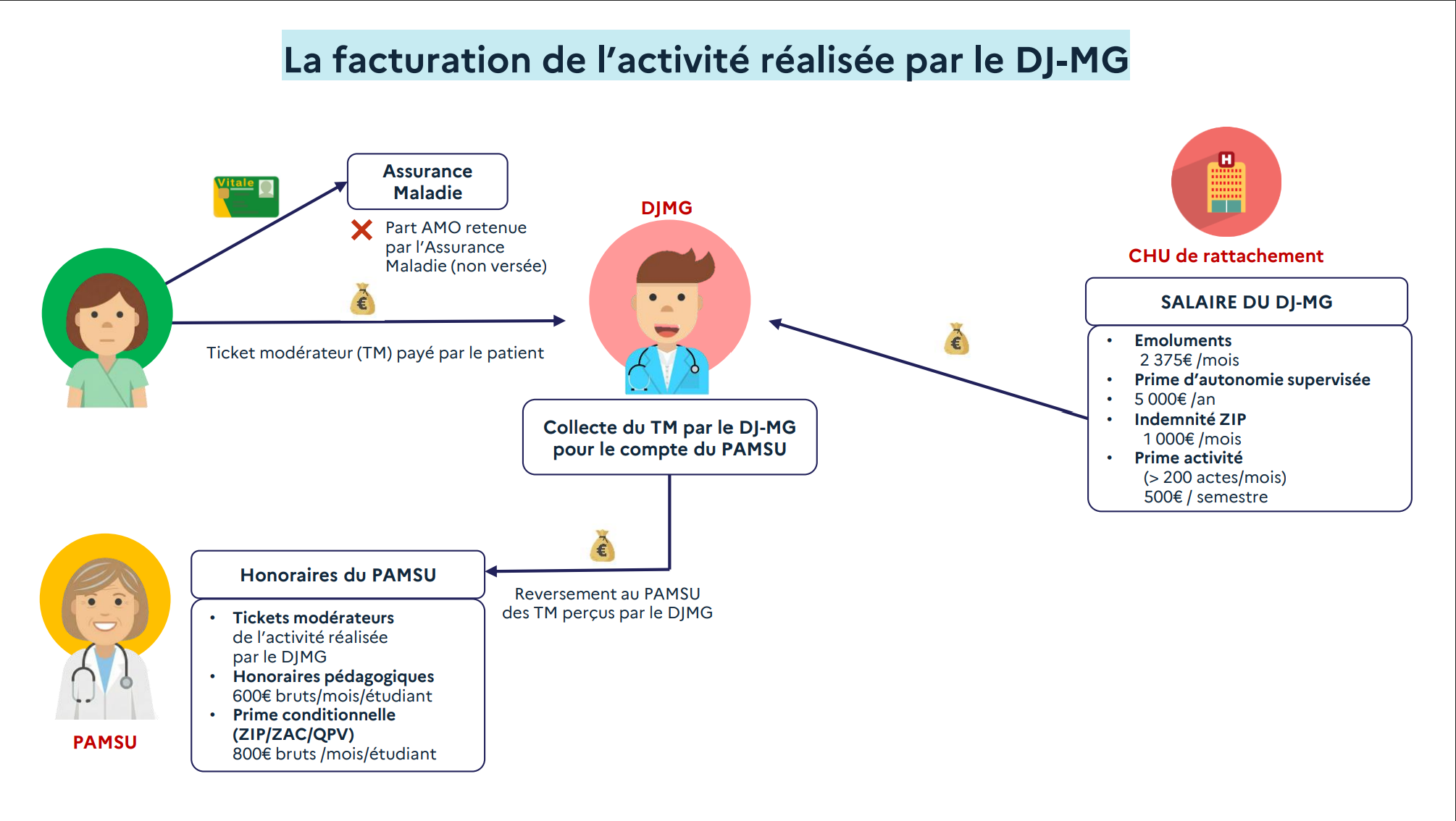 Autre interrogation apportée par la simulation de la DGOS : à qui va bénéficier la part AMO perçue par l'Assurance maladie sur les actes réalisés par les futurs DJ ? Pour Richard Talbot, l'Assurance maladie sera "la grande gagnante". En effet, si on prend en compte "21 euros de part AMO de la consultation, multipliés par 20 consultations [par exemple] par jour, multipliés par trois jours de travail par semaine et 4,3 semaines mensuelles en moyenne", on obtient "5418 euros mensuels de rente du DJ" qui sont transmis à l'Assurance maladie, calcule Clément Hugueny. Un chiffre loin des 2375 euros d'émoluments fixes qui seront versés chaque mois par les CHU aux futurs DJ.