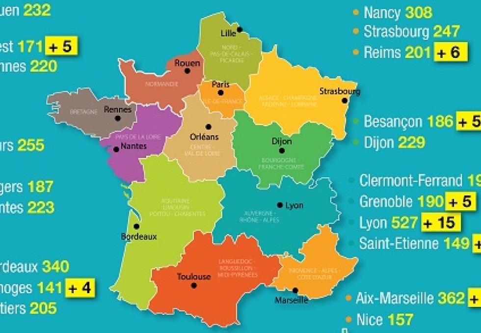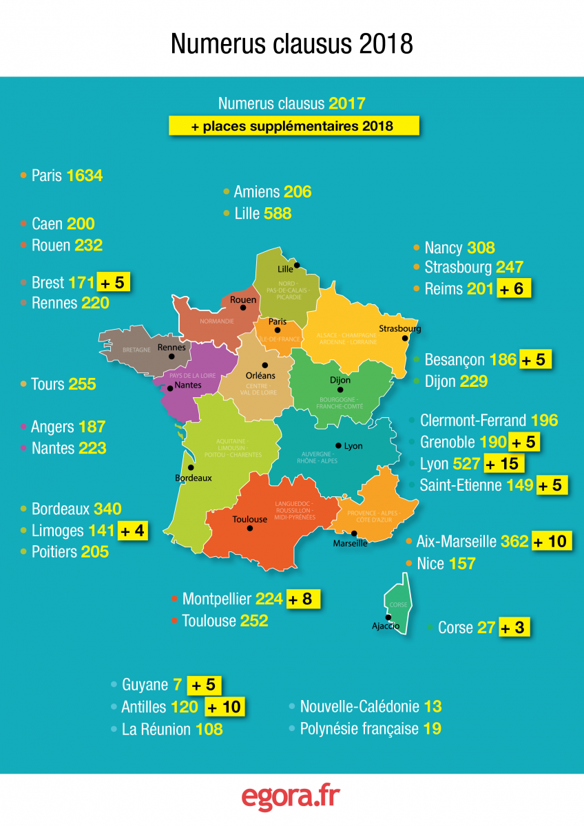 L'an passé, Lyon et Paris avaient comptabilisé à elles seules 221 places supplémentaires. Cette année, les facs parisiennes restent à 1634 places, tandis que Lyon décroche encore 15 places supplémentaires, pour arriver à 542, derrière Lille (588 places pour 2 facs). La fac d'Aix-Marseille et la fac des Antilles auront chacune 10 places en plus, Montpellier 8, Reims 6, tandis que la Guyane, Brest, Besançon, Saint-Etienne et Grenoble en obtiennent 5. Le détail, fac par fac, sur notre carte.   [avec legifrance.gouv.fr]
