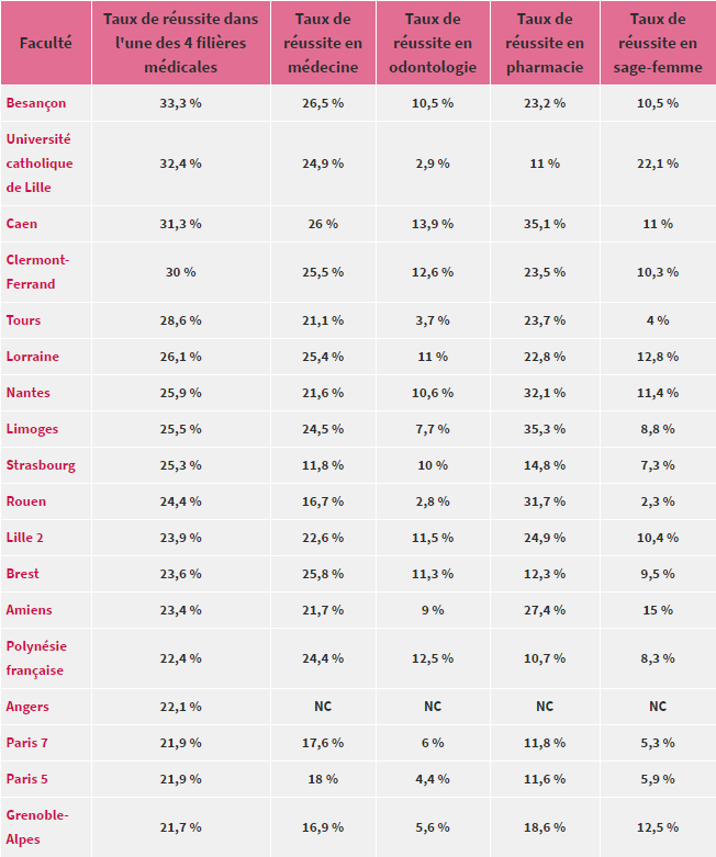 Le magazine L'Etudiant, a réalisé un classement des universités, qui offrent le plus de chance aux inscrits à la PACES, la première année commune des études de santé. Pour la médecine, par exemple, pour l'année 2015-2016, les taux de réussite évoluent de 11,8 % (Strasbourg) à 26,5 % (Besançon), alors que la moyenne nationale se situe à 18 %. En moyenne nationale, pour les futurs médecins, dentistes, pharmaciens ou sages-femmes, le taux de réussite est de 22 %.
