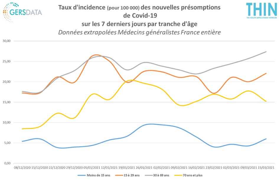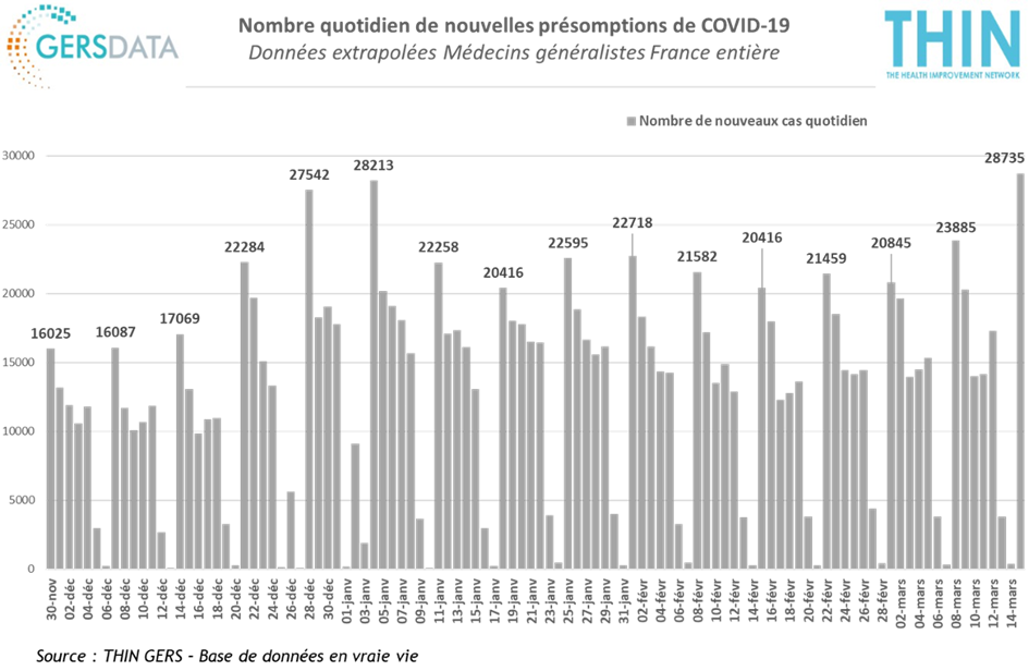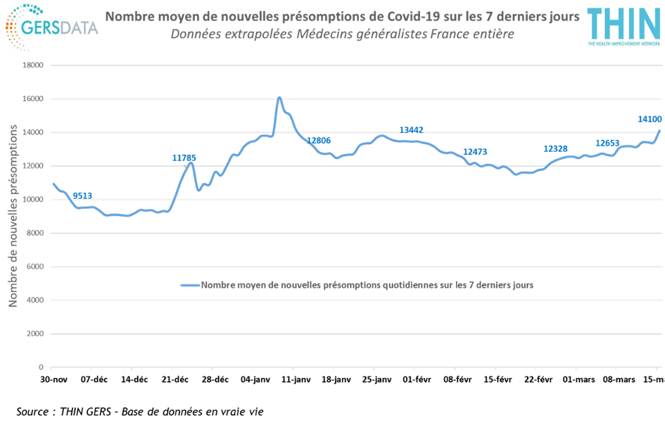 Les nouvelles de l’épidémie liée au Sars-CoV-2 ne sont pas bonnes et se trouvent malheureusement confirmées par les dernières données publiées par le panel national de médecins généralistes THIN-Cegedim. En effet, les nouvelles présomptions d’infection au Sars-CoV-2 vues dans les cabinets de médecine générale étaient ce lundi 15 mars en hausse de 20% par rapport au lundi précédent, nous ramenant à la situation observée le 3 janvier.