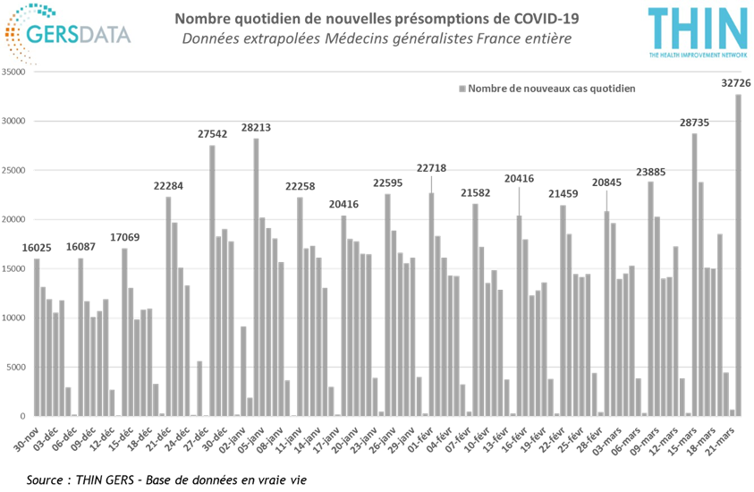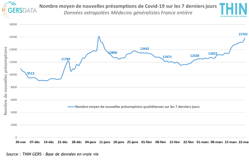 Rythme de progression restant à un niveau préoccupant, de +13%, inchangé depuis 3 semaines. Telles se résument les données du panel THIN-Cegedim de médecins généralistes France entière. Ajoutons qu’il faut remonter au 16 novembre pour avoir ce niveau de nouvelles présomptions.