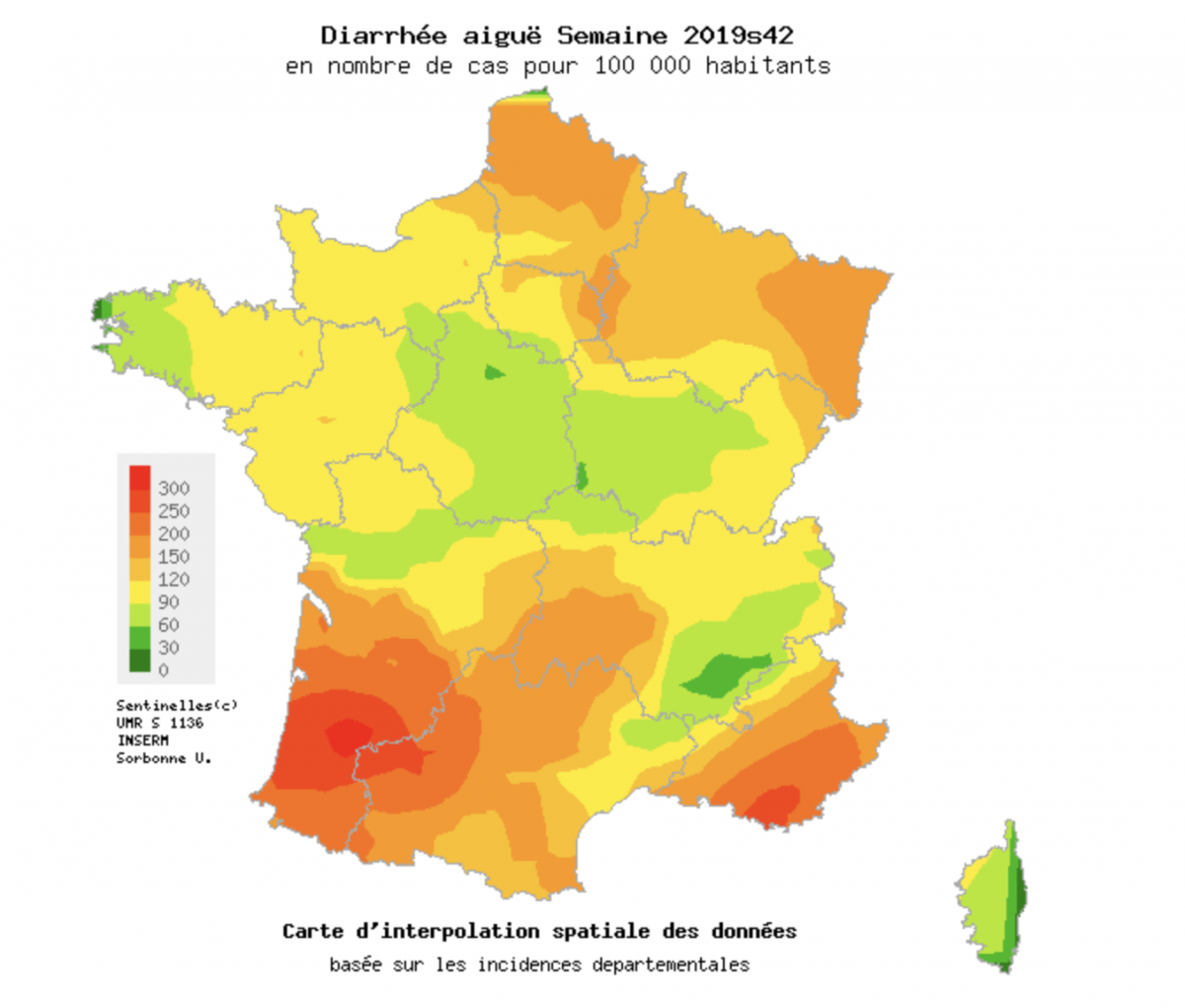 Plus globalement, sur la semaine du 14 au 18 octobre, le taux d’incidence de cas de diarrhée aiguë vus en consultation de médecine générale a été estimé à 143 cas pour 100 000 habitants.