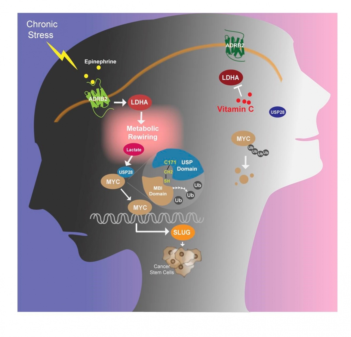 Les auteurs ont travaillé sur un modèle expérimental de souris à risque élevé de cancer du sein. Ces souris ont été parquées durant une semaine dans un enclos exigu, provoquant un stress continu. Puis les souris ont été divisées en deux lots, l’un maintenu dans l’enclos exigu, l’autre mis dans un enclos suffisamment grand et confortable pour faire disparaître le stress. Les souris exposées au stress ont non seulement modifié leur comportement, témoignage de leur niveau d’anxiété et de dépression, mais ont aussi développé des tumeurs mammaires plus importantes en taille et croissant plus rapidement que chez leurs congénères non soumises au stress. Les analyses biologiques et histologiques ont permis de montrer que les tumeurs développées chez les souris stressées contenaient un nombre bien plus élevé de cellules souches cancéreuses, lesquelles interviennent non seulement sur la vitesse de croissance des tumeurs mais aussi sur leur essaimage à distance (métastases). Si le stress favorise l’oncogenèse, c’est dit-on via le cortisol qui inhibe le système immunitaire. Or, ce travail montre que le taux de cortisol est plus bas chez les souris exposées durant un mois au stress que chez les souris du groupe contrôle. Si le stress favorise les cancers, ce n’est donc pas en raison d’une immunodépression induite par un cortisol élevé. Les auteurs de l’étude citée en référence montrent que les souris exposées au stress chronique mais recevant un médicament bloquant un récepteur adrénergique (ADRB2) ont des tumeurs plus petites et moins de cellules souches cancéreuses que les souris exposées au même stress mais ne recevant pas ce médicament. Selon ces chercheurs, c’est l’adrénaline qui créerait le lien entre stress et cancers car une fois fixée aux récepteurs ADRB2, cette hormone boosterait les niveaux de lactate déshydrogénase activant à leur tour des oncogènes et la production de cellules souches cancéreuses, tout en libérant de grandes quantités de lactate dont se nourrissent les cellules cancéreuses pour assurer leur prolifération.